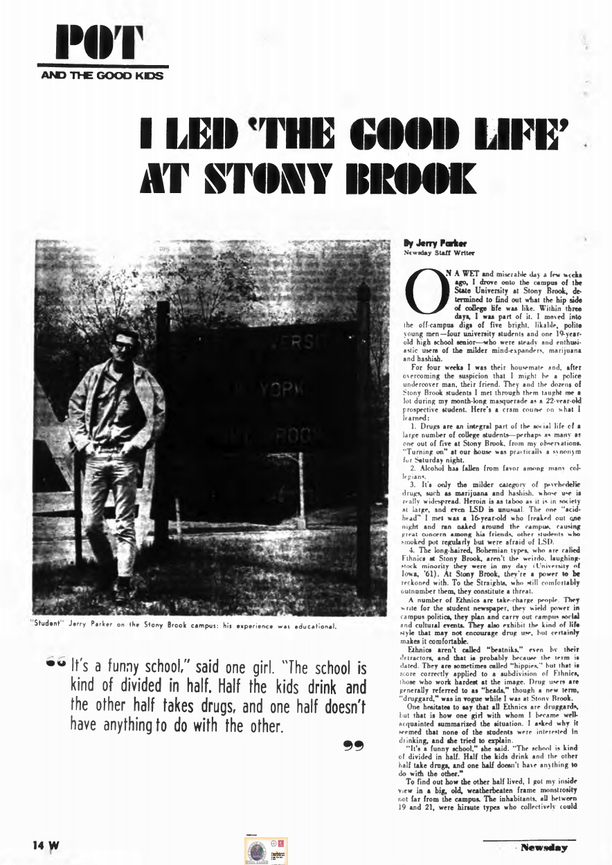 Regarding the Jerry Parker article - yeah, it was a four page article that he wrote to "expose" the freaky, doped-up life of Stony Brook and its freak scene.
