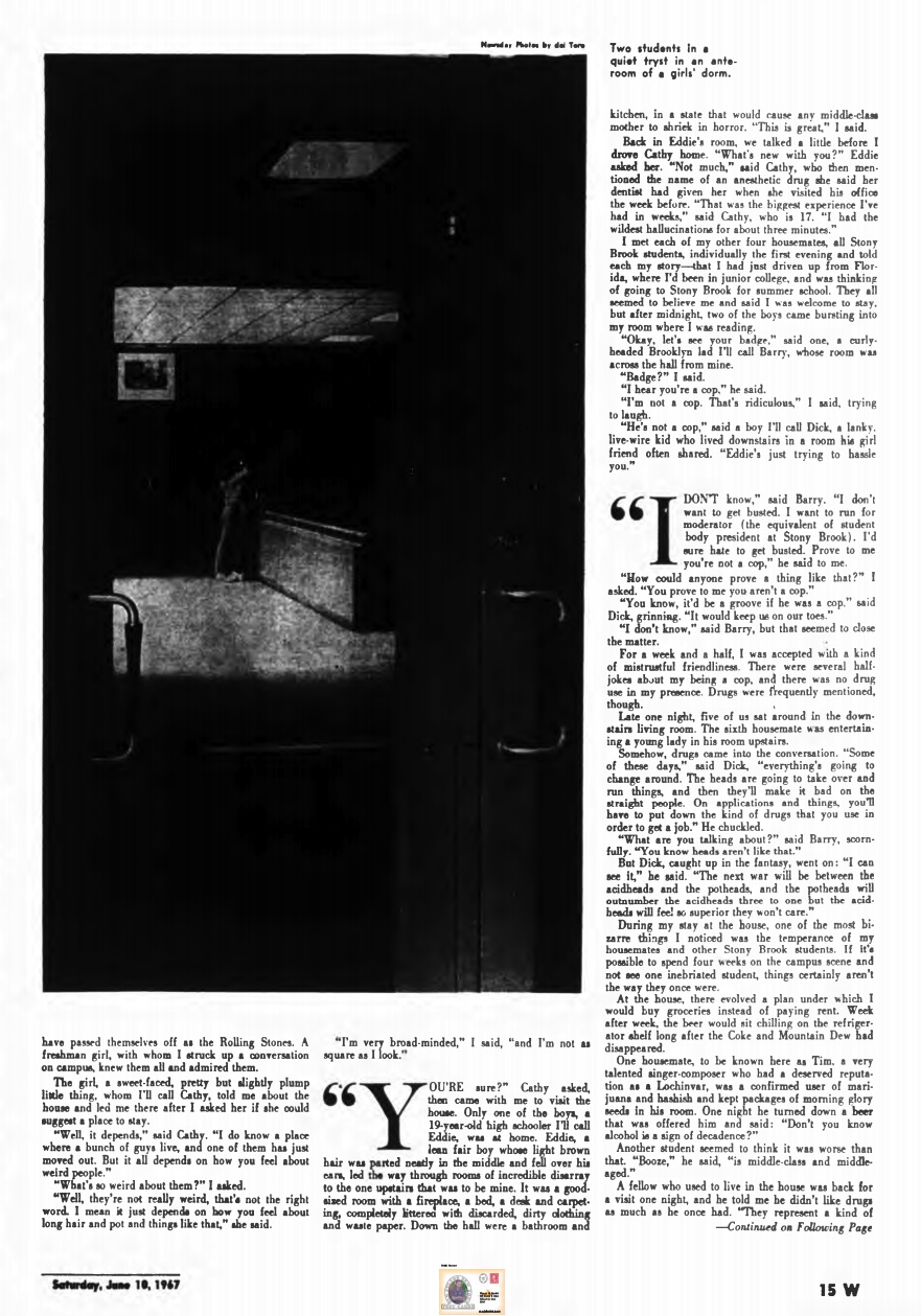 "I don't know," said Barry. "I don't want to get busted. I want to run for moderator (the equivalent of student body president at Stony Brook). I'd sure hate to get busted. Prove to me you're not a cop," he said to me.