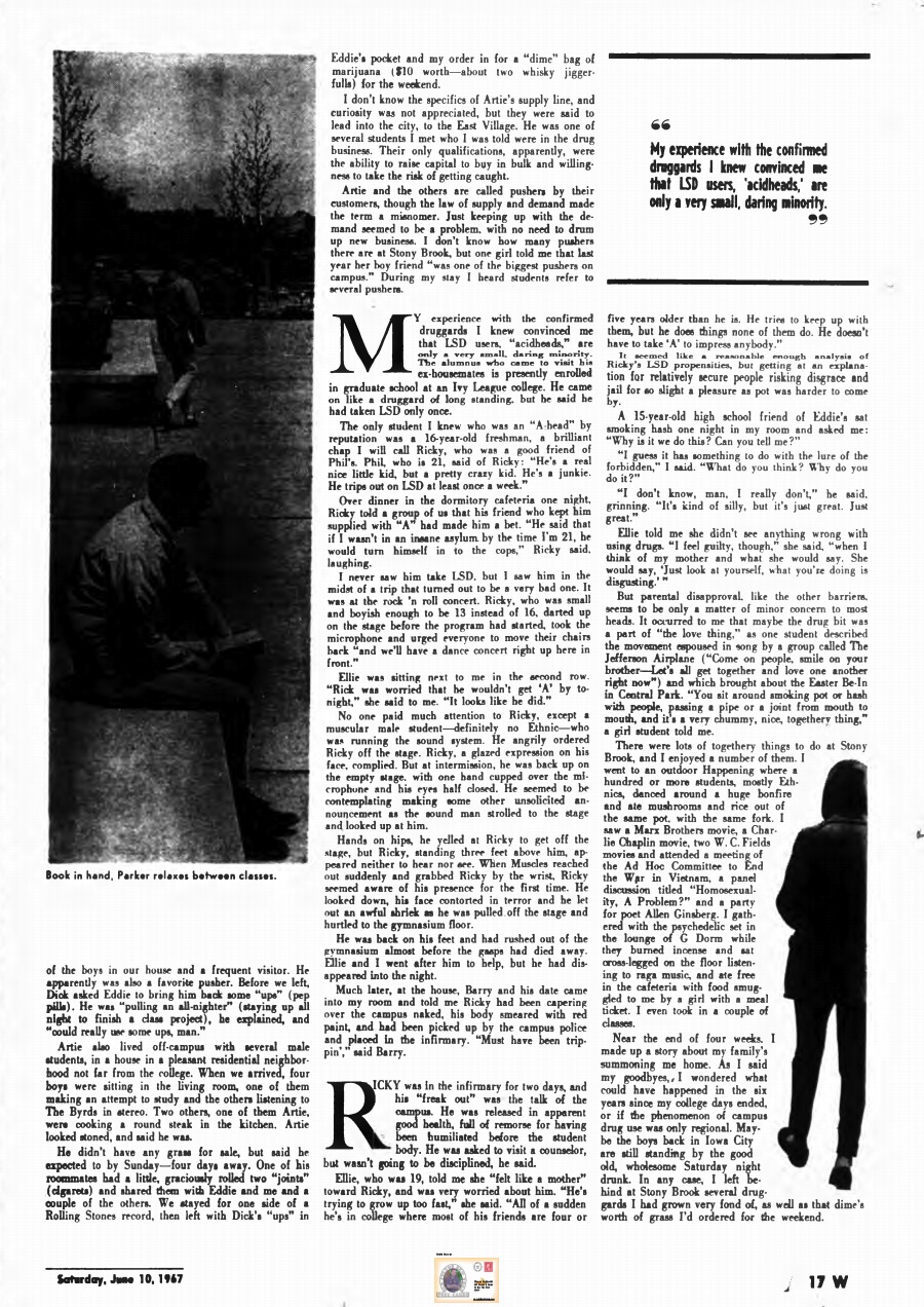 The only student I knew who was an "A head" by reputation was a 16-year-old freshman, a brilliant chap I will call Ricky, who was a good friend of Phil's. Phil, who is 21, said of Ricky: "He's a real nice little kid, but a pretty crazy kid. He's a junkie. He trips out on LSD at least once a week."